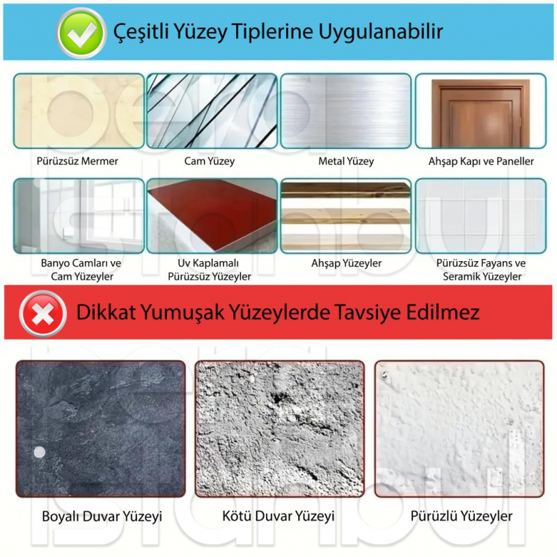 Not : Sadece Düz, Pürüzsüz ve Boyasız Zeminlerde Sağlam olarak Tutmaktadır. Diğer zeminler için uygun değildir.
